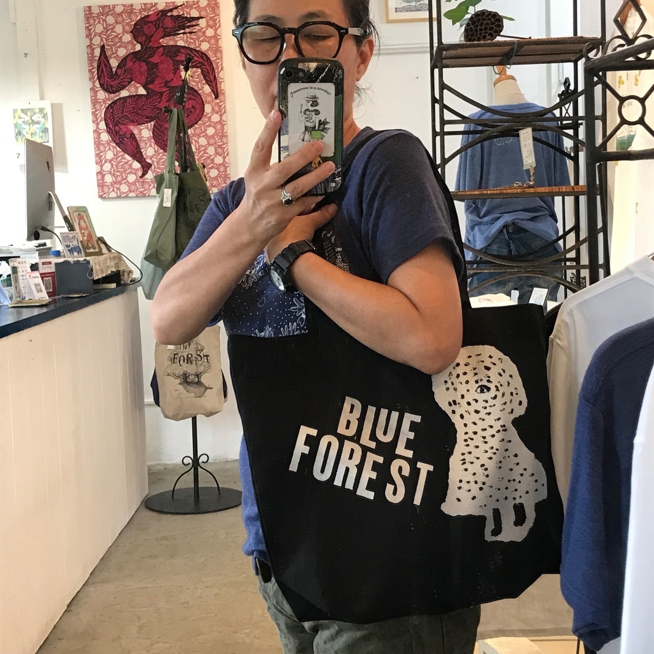 ホワイトシルバーのインクでBLUE FORESTのキャラクターひとつめちゃんをハンドプリント