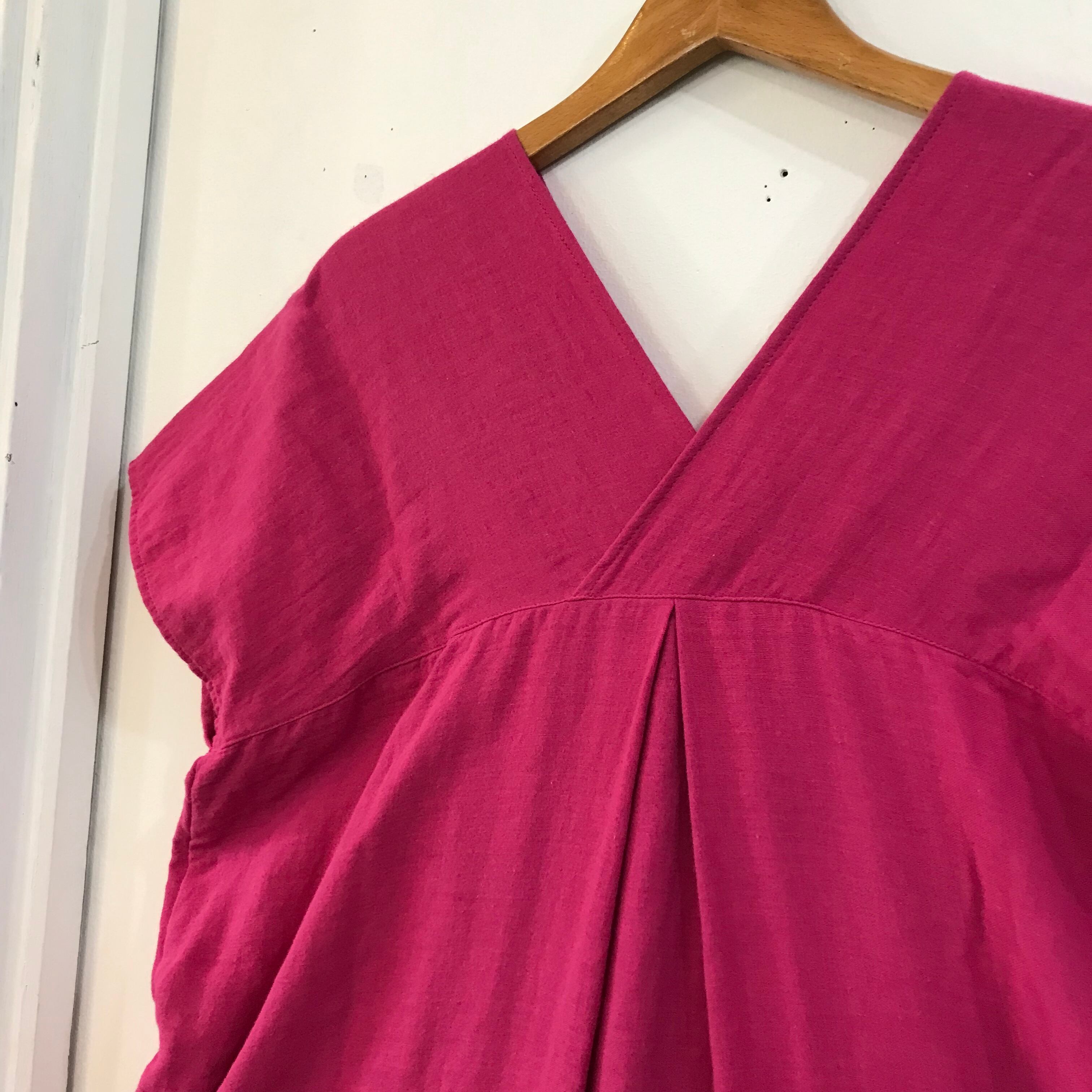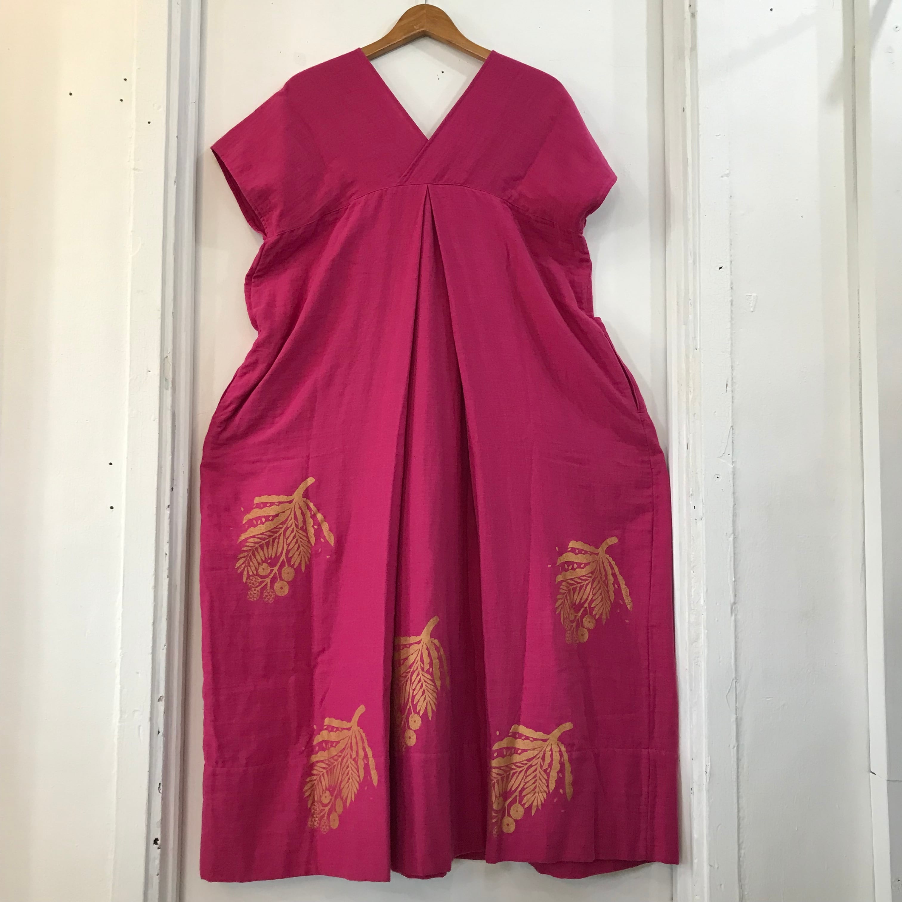 優しい鮮やかなブーゲンビリアのようなアザレアカラーのWガーゼに落ち着いたゴールドのギンネムをハンドプリントしています。インドの千夜一夜物語のように、アンクレットをつけて歩いて欲しい。。そんなワンピースです。