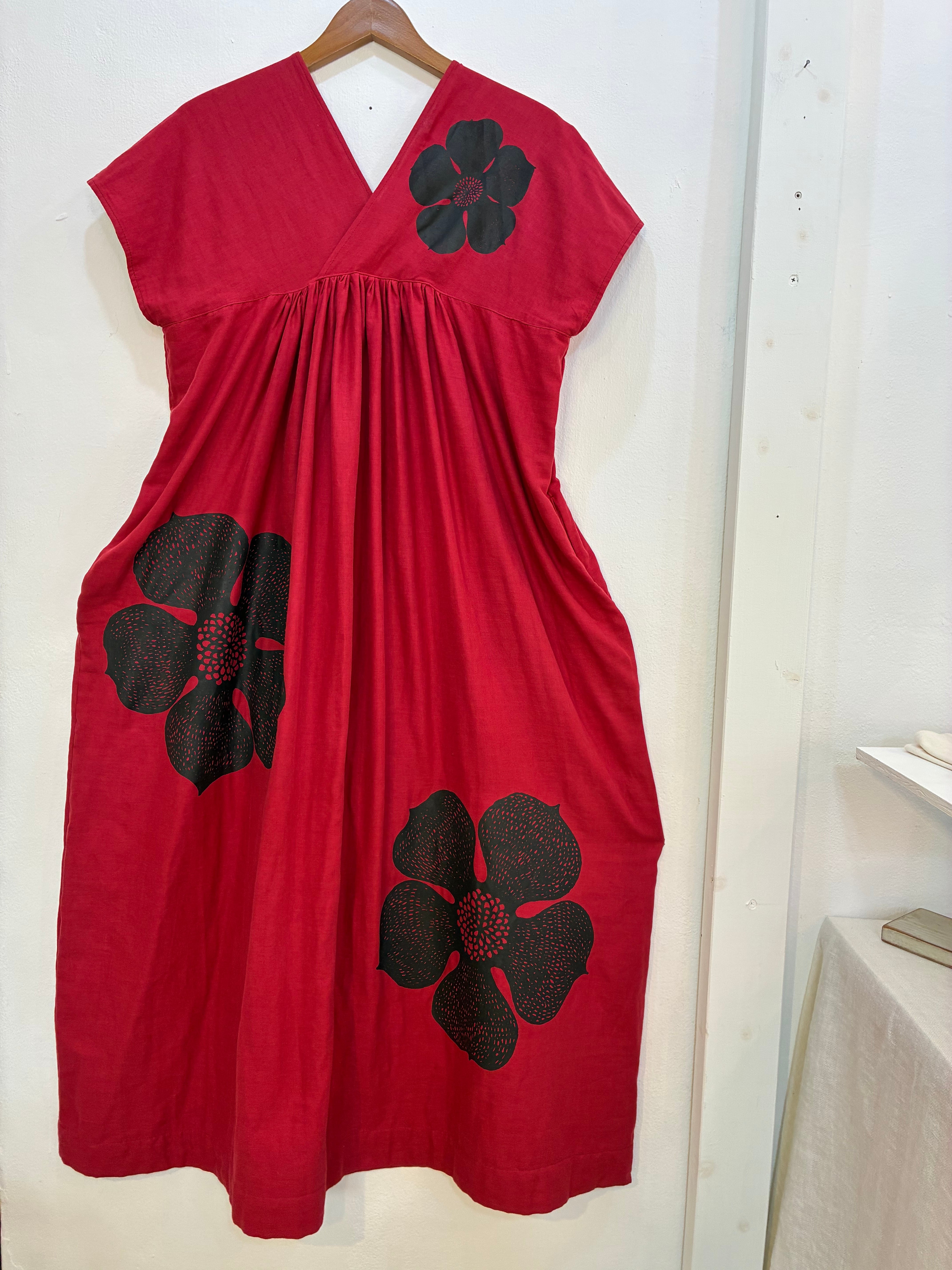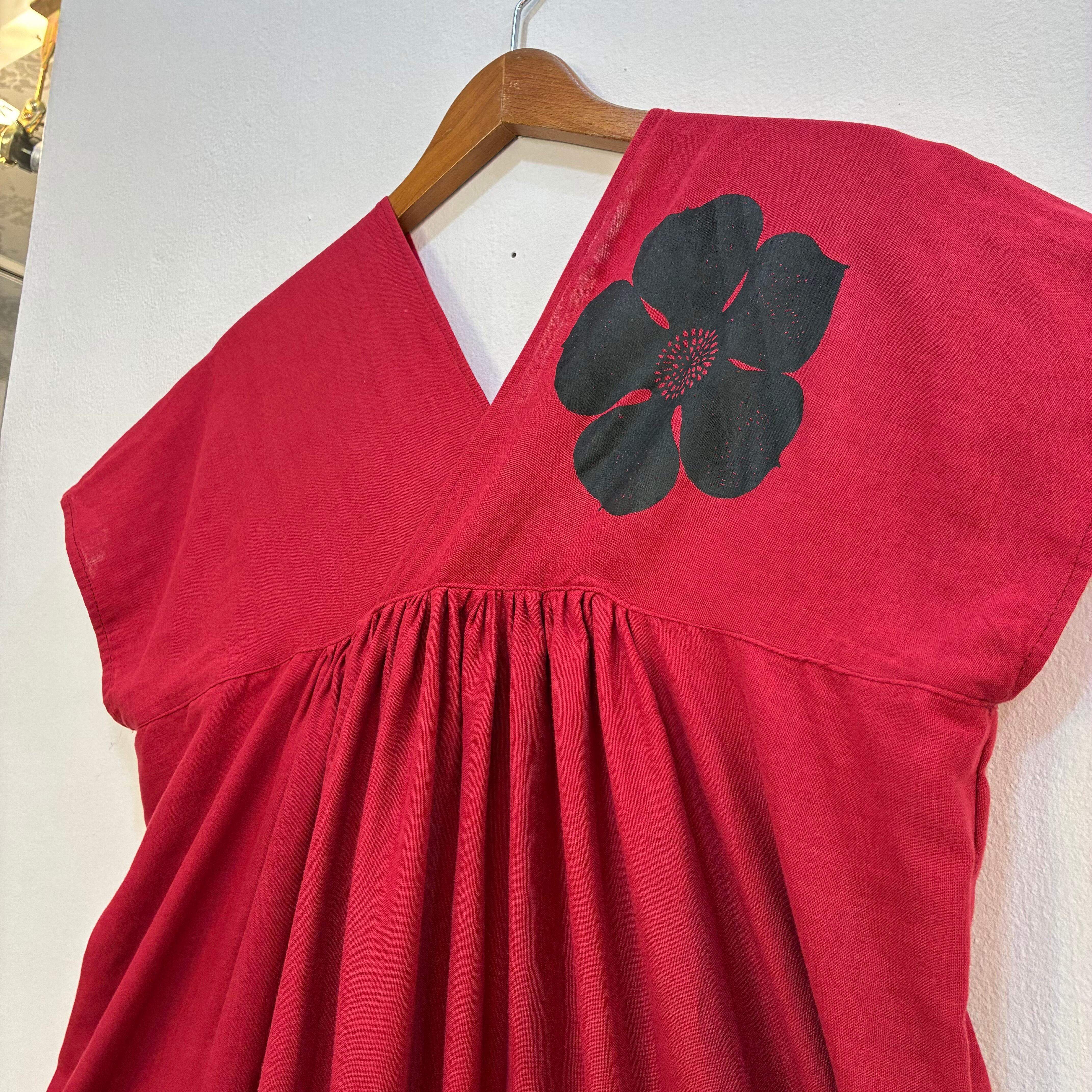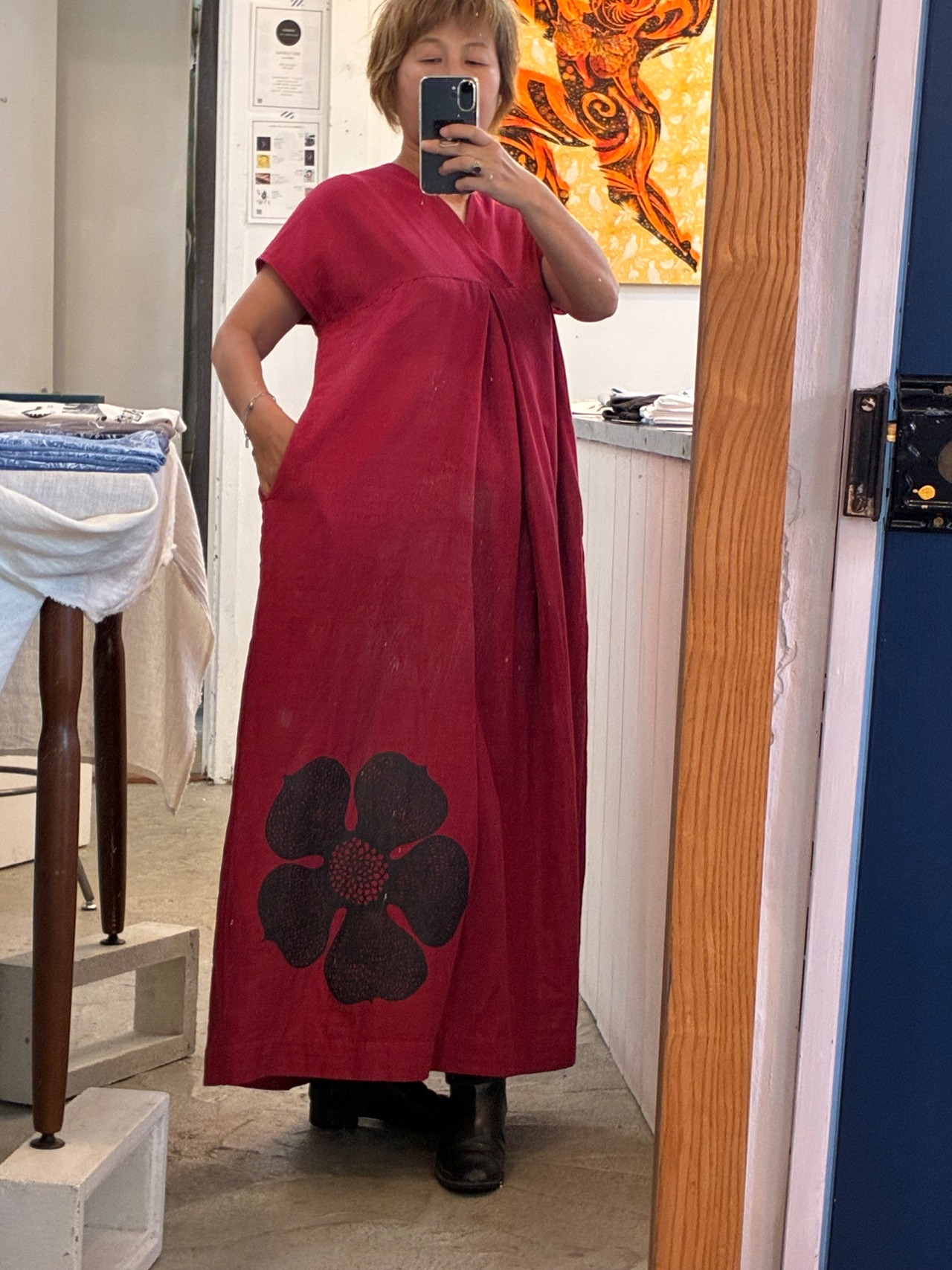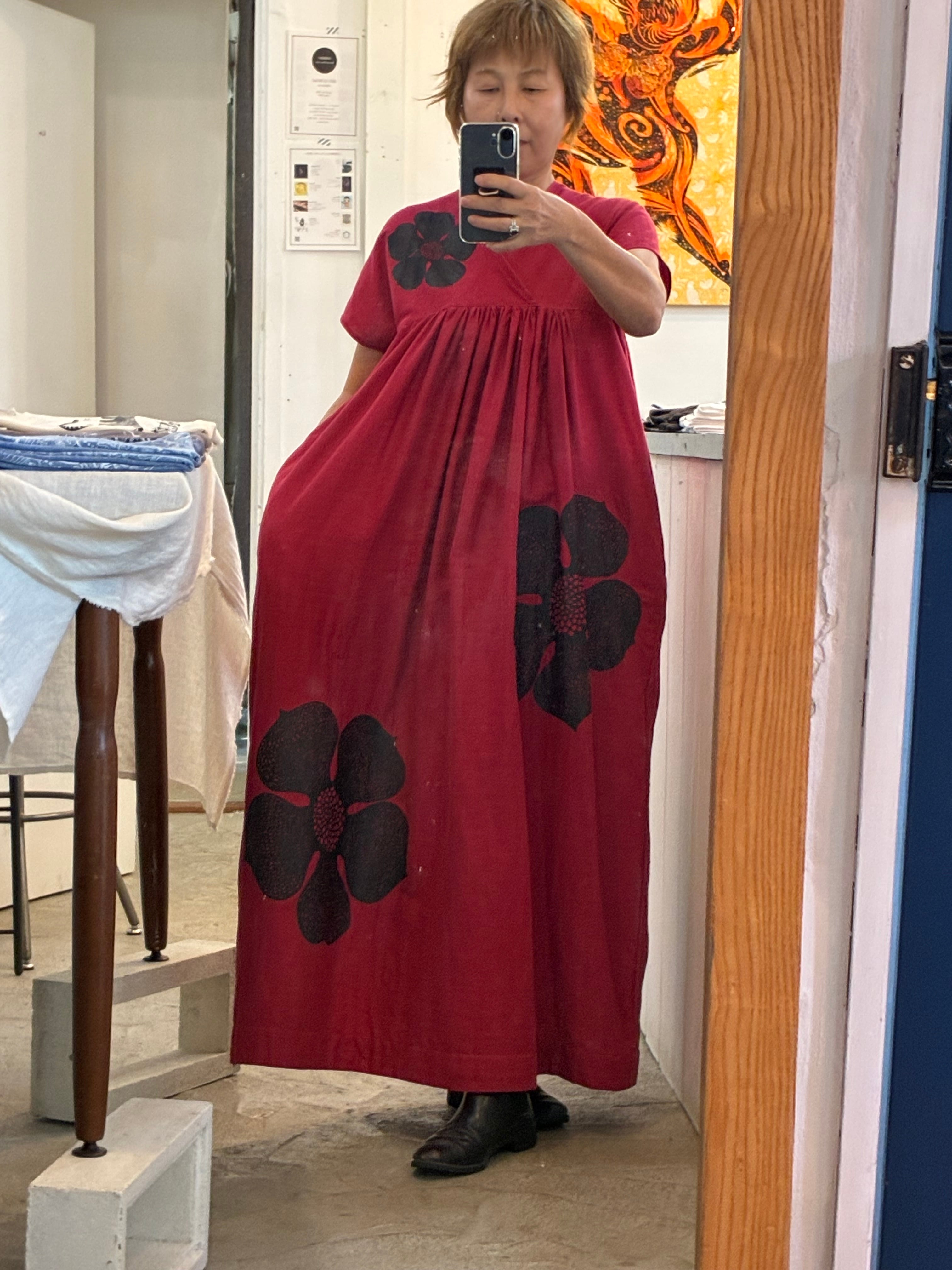 深めだけどふんわりビビットなガーネット色にビッグフラワーデザインをブラックで刷りました。