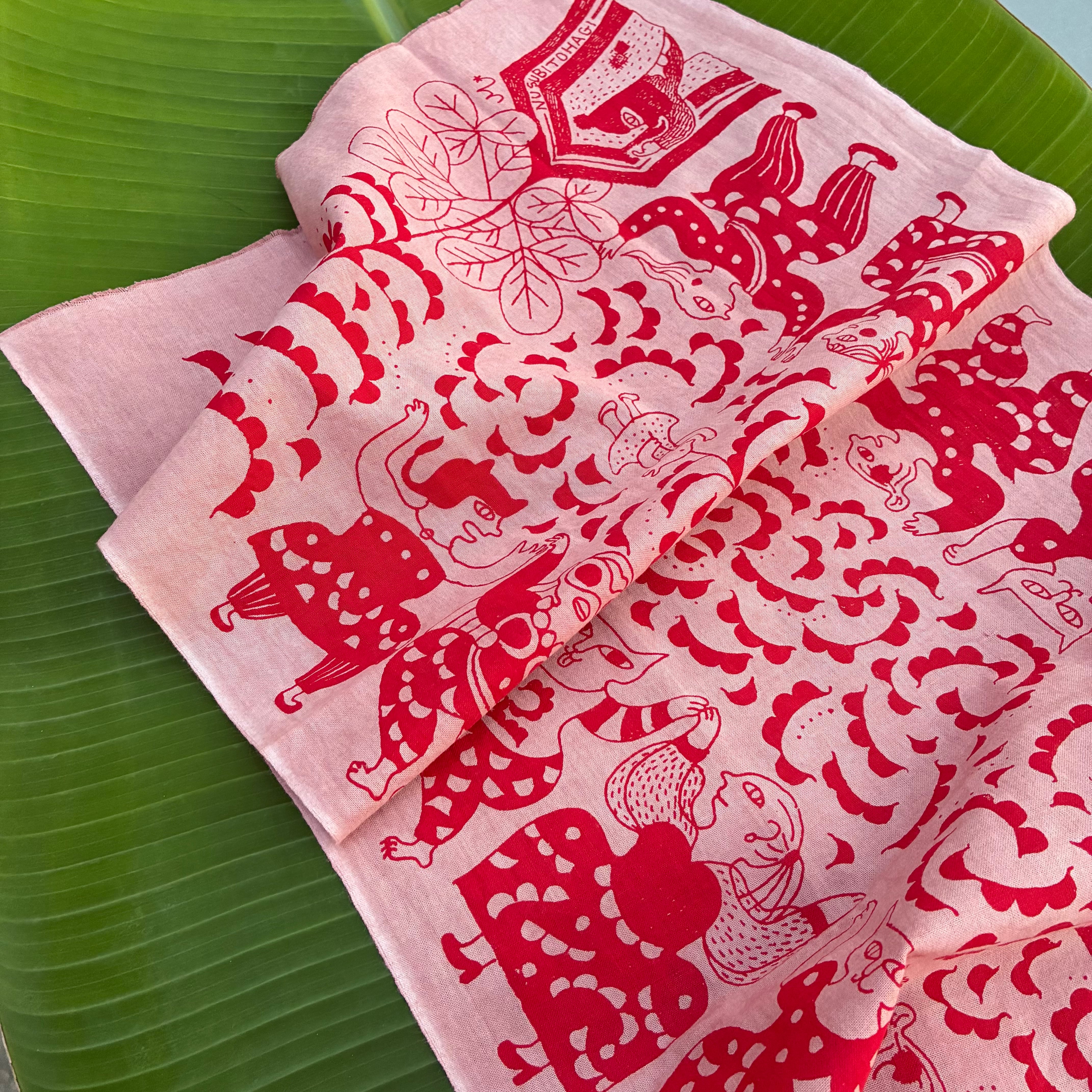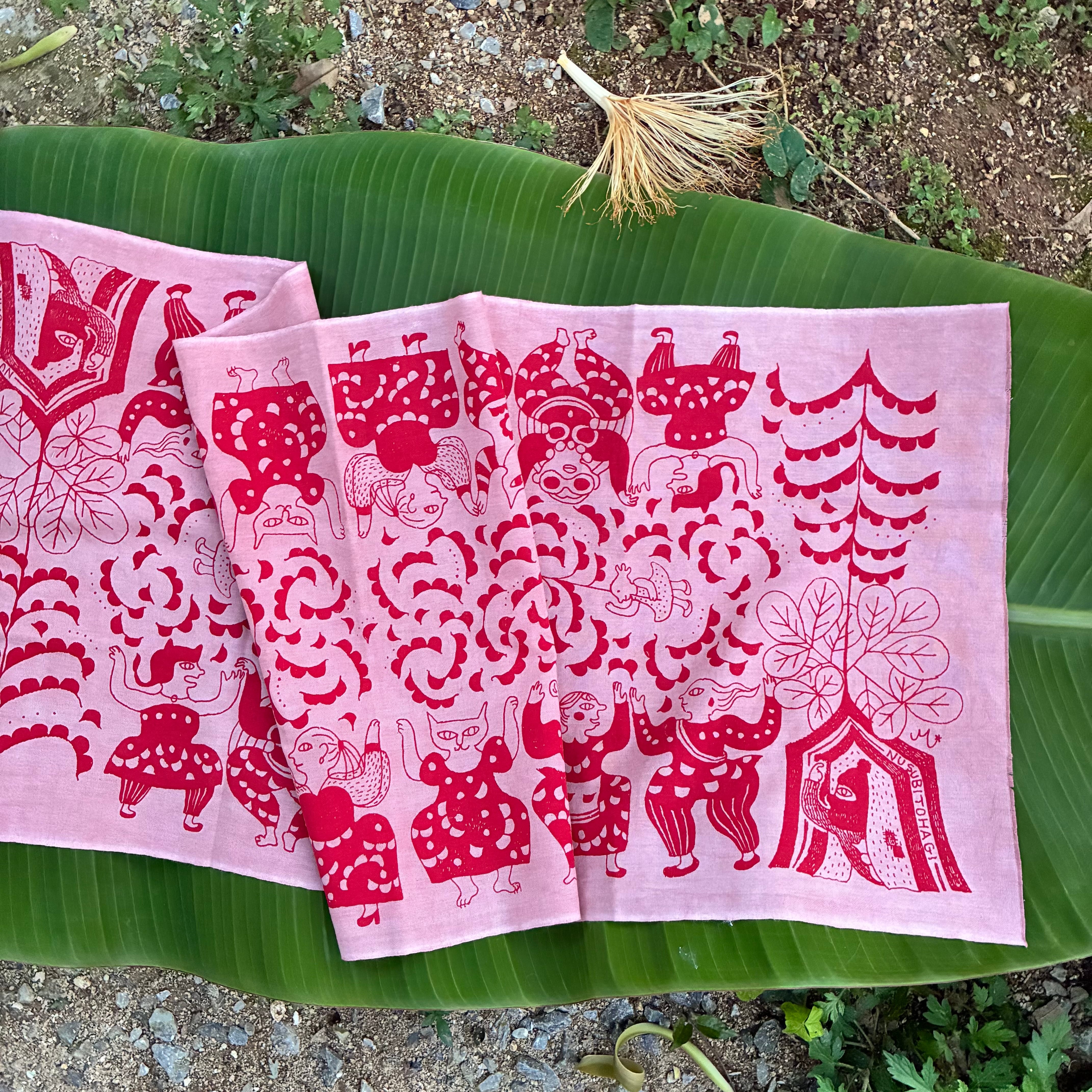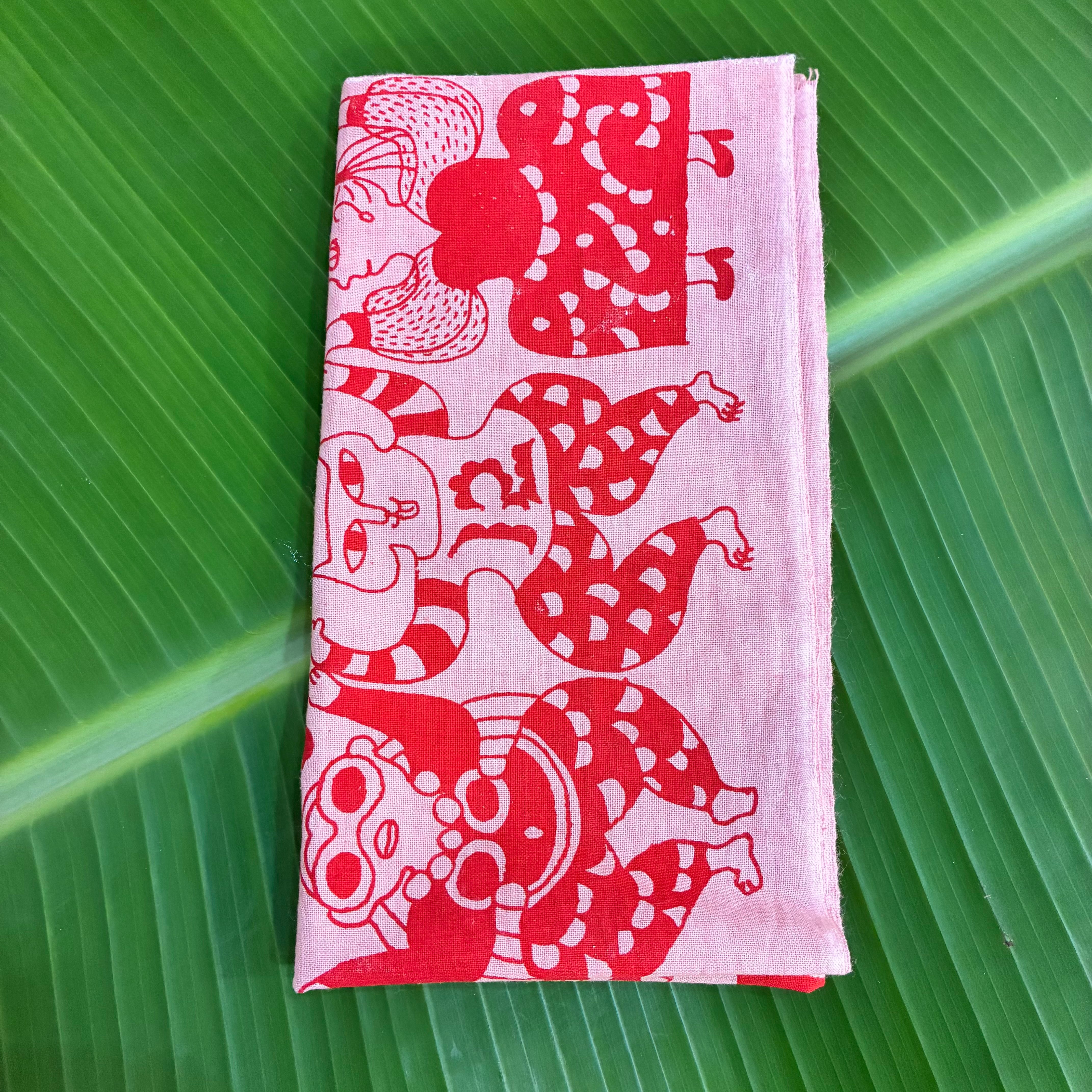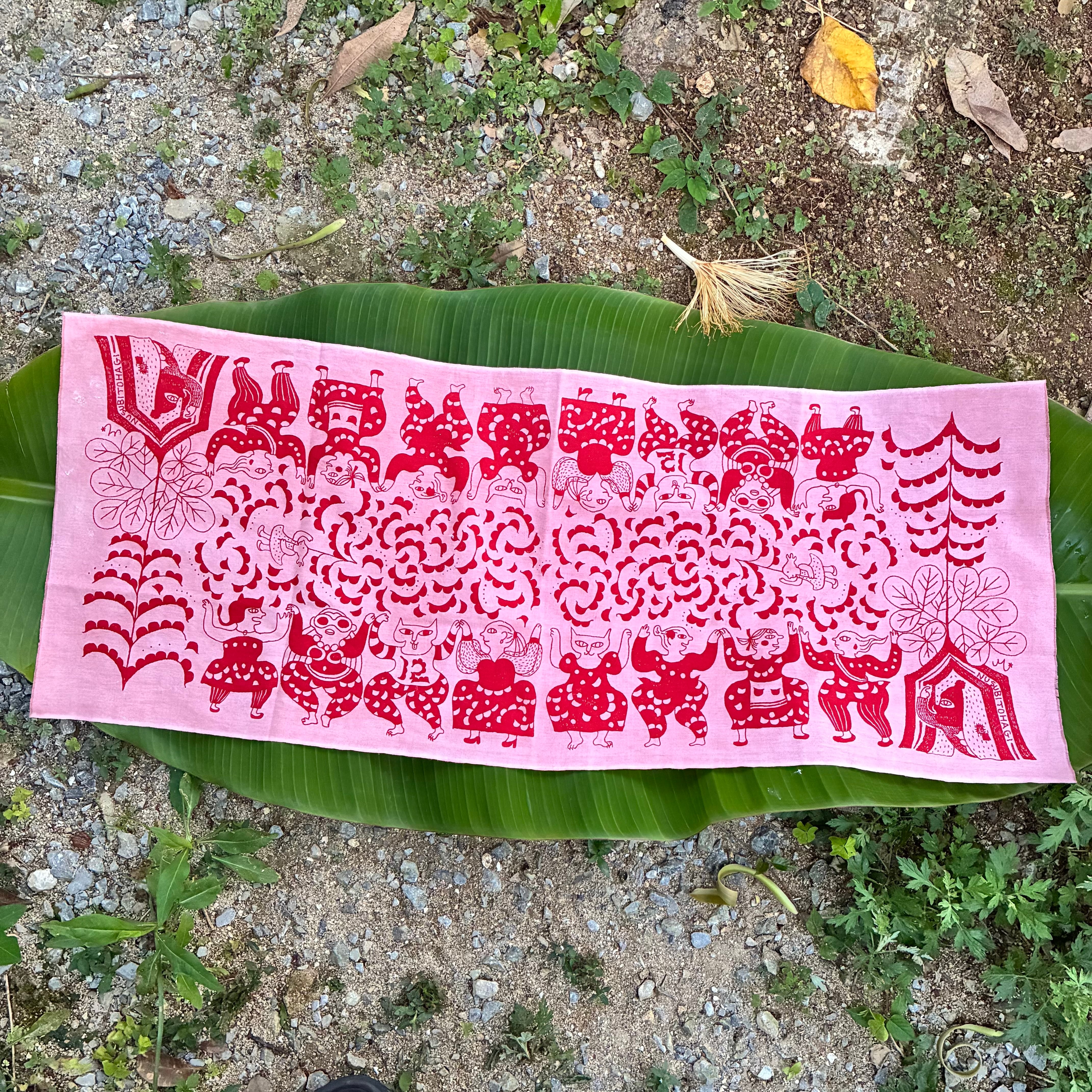 ミツさんのハンドプリント手ぬぐい生地を最古の顔料であり、大地の結晶である「ベンガラ」で染め上げました。